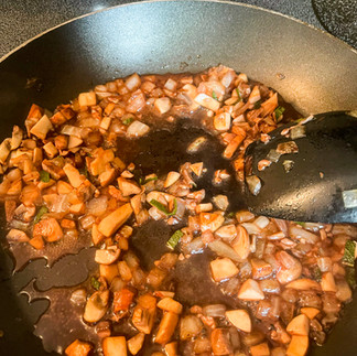 Back at home, it was time to cook. I got started on the dough and all the prep work while Matt showered after the run. The dough was easy enough to throw in the stand mixer with a dough hook. All the ingredients went right into the bowl, I turned it onto medium-low and was able to work on other things for about five minutes. Knowing that all fillings needed time to cool before stuffing the ravioli, I got to work on those. Cooking the Italian sausage for Matt's ravioli was the first step. Then I focused on chopping up onion and mushrooms and garlic for my filling. At this point the dough was ready to finish up with some hand-kneading. Once smooth, the dough was set aside to rest.